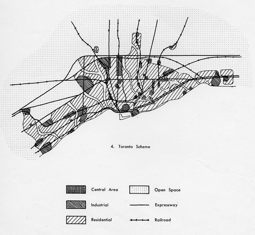 Basic form proposed for the Toronto metropolitan area, from the preliminary pages of the 1959 plan. Unlike almost all other postwar metropolitan plans, Toronto would have no satellite towns; nearly all urban development was to be contiguous.