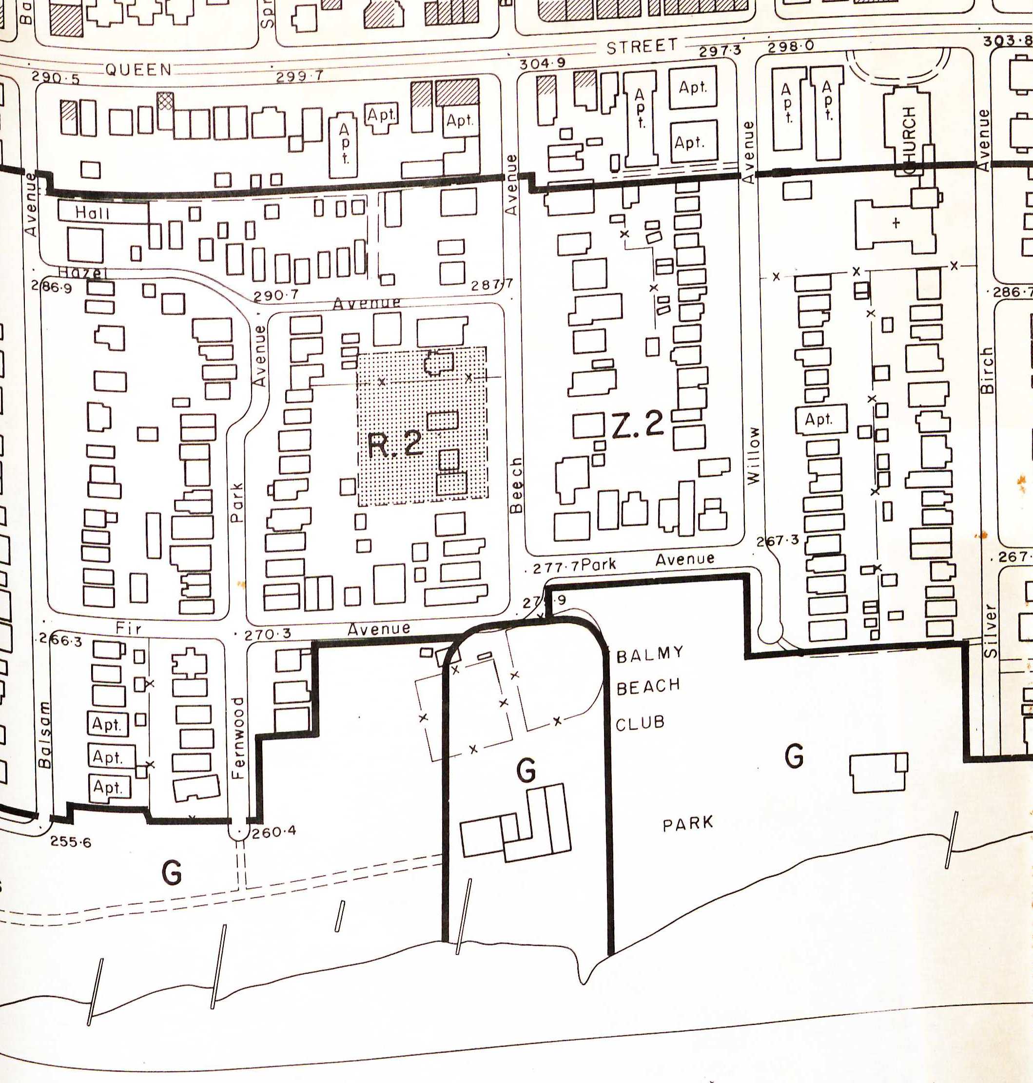 One of their most curious rejections, both in terms of what was proposed and what resulted, was of a high-rise scheme for a residential street in the eastern part of the city’s Beaches neighbourhood – something that seems inconceivable now. It was proposed by a group called River Oaks Development Limited, about which nothing further came to light in the course of my research (though it was represented by a downtown Toronto law firm, so likely was local). River Oaks had acquired five contiguous residential properties on the west side of Beech Avenue, south of Queen Street, and felt that the assembled properties, taken altogether, formed a site large enough for high-rise apartment buildings (in the plural). The key, as with nearly all other such proposals, was that the residential lots – which had been laid out more than fifty years earlier – were unusually deep, extending more than half-way into the block; this in fact is likely what drew the developers to the site. The lots did need to be re-zoned to a higher residential density, however, and the developer’s request for this, in November 1962, brought the proposal to the planning board for assessment – though the developer did not yet have a proposed building design.