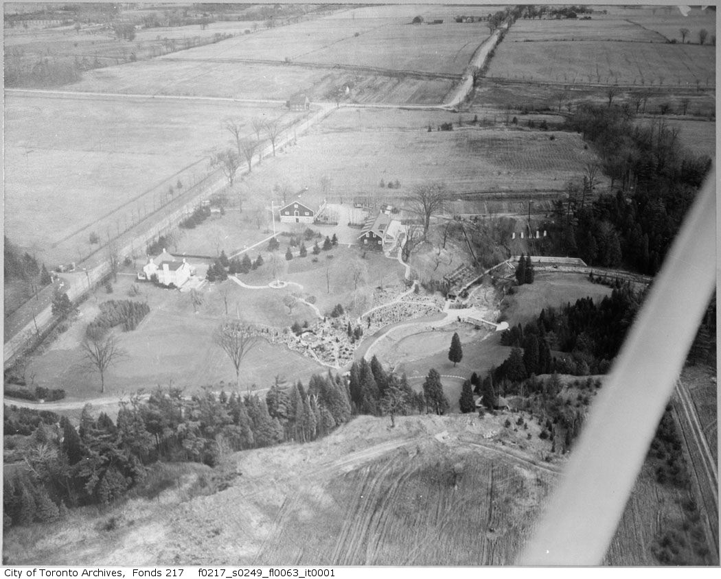 Aerial Photograph of Edwards Gardens, Wilket Creek Ravine, c.1957. Metropolitan Toronto purchased this landscaped garden from the private owners who had created it, and subsequently expanded it into a large public facility. (City of Toronto Archives)