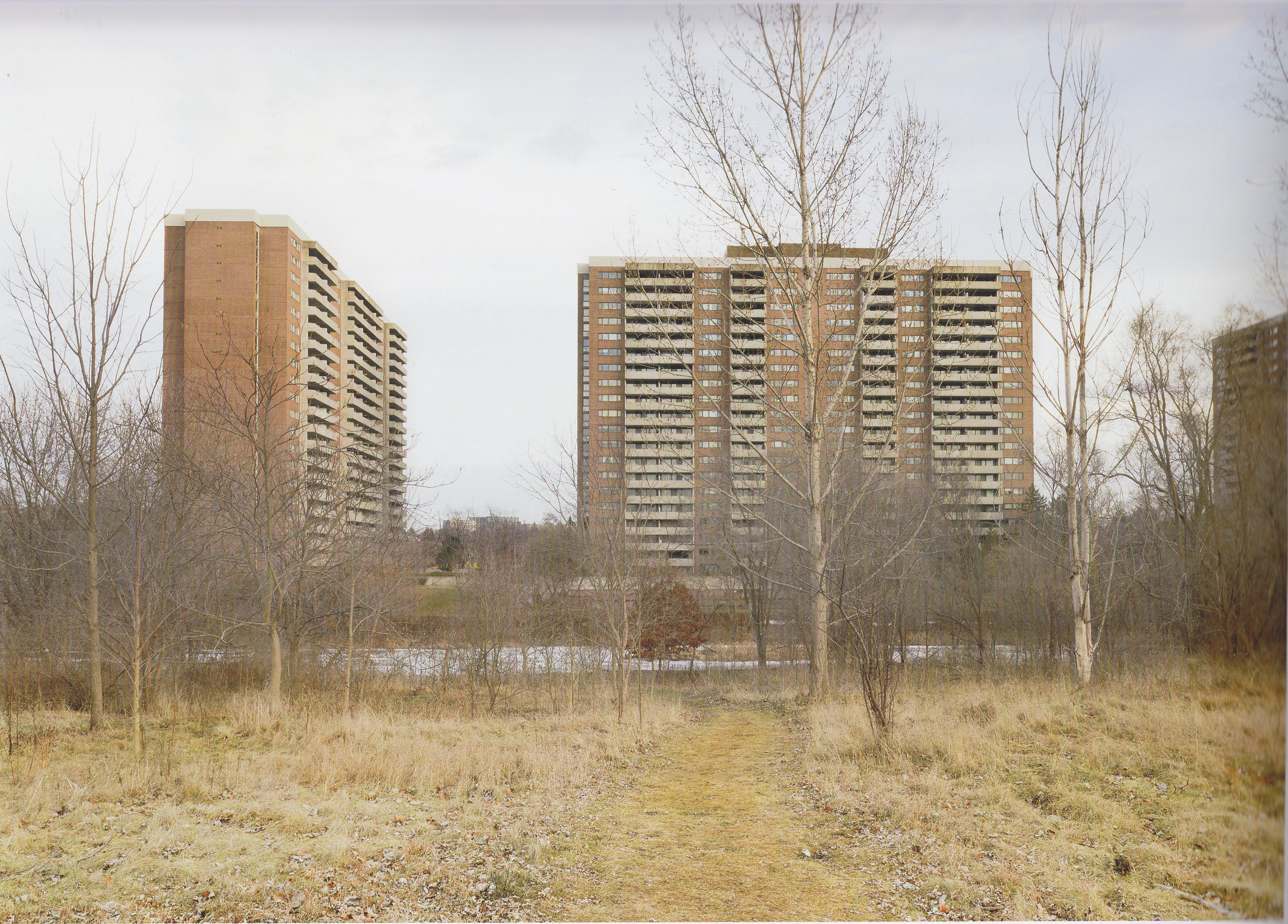 It is also an essential ingredient of Burley’s photographs, many of which contain a subtle tension between the natural and non-natural; subtle because in Burley’s non-judgmental, humanistic hands the tension is touching rather than critical or ironic, but unmistakably present nonetheless. “Lower Don River” shows us not just a silent swollen river but six lanes of noisy speeding traffic alongside it. Paging through the book – the title of which is Enduring Wilderness – one sees towering bridge piers in “Couple, Humber River, Lambton Park”, imposing electrical poles and lines in “Footpath, Lower Don Parklands”, and massive highway infrastructure in “Fishing Beneath the Macdonald-Cartier Freeway, Rouge Park”. There are the overwhelming “Rail and Traffic Bridges, Humber River”, the feral, non-native “Catalpa Tree, Sunnydene Park”, and the degraded “Cormorant nesting area, Tommy Thomson Park”. And then there are the high-rise buildings, some front and centre and some in the hazy distance, in what seems to be every second image